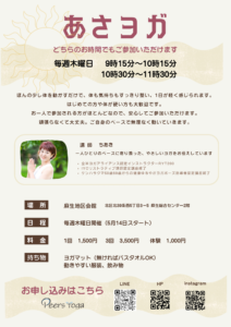 あさヨガ 10:30 あさヨガ 2026.03.27 イベント詳細 このイベントは 14 5月 2026 から 31 12月 2026 まで開催しています。 次回の開催は 2026年5月14日 10:30 AM です。 会場: 麻生総合センター内 麻生地区会館2F 和室 カテゴリ: あさヨガ 開催日: 2026年5月14日 10:30 AM – 11:30 AM2026年5月21日 10:30 AM – 11:30 AM2026年5月28日 10:30 AM – 11:30 AM2026年6月4日 10:30 AM – 11:30 AM2026年6月11日 10:30 AM – 11:30 AM2026年6月18日 10:30 AM – 11:30 AM2026年6月25日 10:30 AM – 11:30 AM2026年7月2日 10:30 AM – 11:30 AM2026年7月9日 10:30 AM – 11:30 AM2026年7月16日 10:30 AM – 11:30 AM2026年7月23日 10:30 AM – 11:30 AM2026年7月30日 10:30 AM – 11:30 AM2026年8月6日 10:30 AM – 11:30 AM2026年8月13日 10:30 AM – 11:30 AM2026年8月20日 10:30 AM – 11:30 AM2026年8月27日 10:30 AM – 11:30 AM2026年9月3日 10:30 AM – 11:30 AM2026年9月10日 10:30 AM – 11:30 AM2026年9月17日 10:30 AM – 11:30 AM2026年9月24日 10:30 AM – 11:30 AM2026年10月1日 10:30 AM – 11:30 AM2026年10月8日 10:30 AM – 11:30 AM2026年10月15日 10:30 AM – 11:30 AM2026年10月22日 10:30 AM – 11:30 AM2026年10月29日 10:30 AM – 11:30 AM2026年11月5日 10:30 AM – 11:30 AM2026年11月12日 10:30 AM – 11:30 AM2026年11月19日 10:30 AM – 11:30 AM2026年11月26日 10:30 AM – 11:30 AM2026年12月3日 10:30 AM – 11:30 AM2026年12月10日 10:30 AM – 11:30 AM2026年12月17日 10:30 AM – 11:30 AM2026年12月24日 10:30 AM – 11:30 AM2026年12月31日 10:30 AM – 11:30 AM ゴールデンウィーク明け、5月14日木曜日より『あさヨガ』が始まります。 初めてでも体が硬い方も大歓迎、一緒に楽しく気持ちよく体を動かしませんか? 時 間 毎週木曜 9時15分から10時15分 10時30分から11時30分 料 金 体験 1000円 1回 1500円 3回 3500円 持ち物 ヨガマット(無ければバスタオルなど) 動きやすい服装 飲み物(お水など) 毎回同じ時間でなくても、予約時にどちらかお選びいただけます。 天候不良や市の施設使用があった場合お休みになる場合がございます。